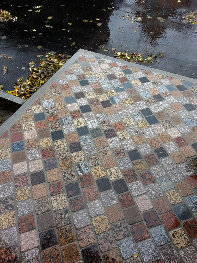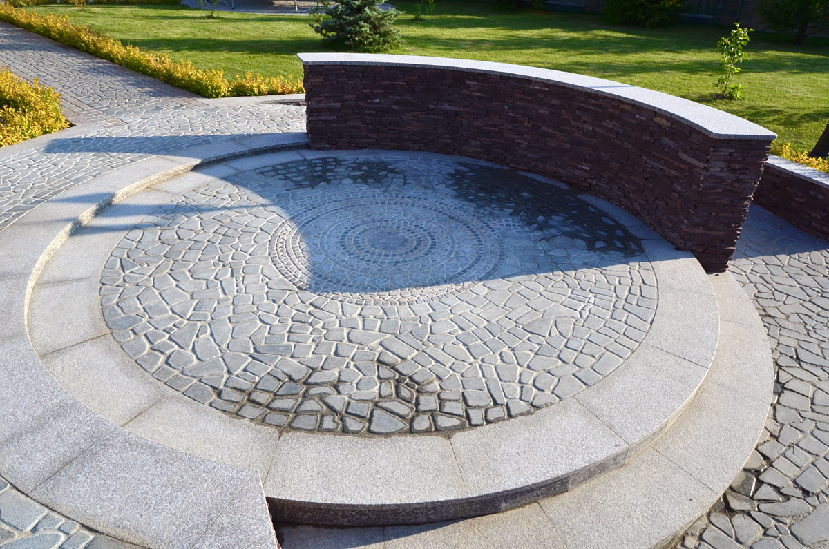 Мощение площадки фонтана, плоский булыжник, серый микс